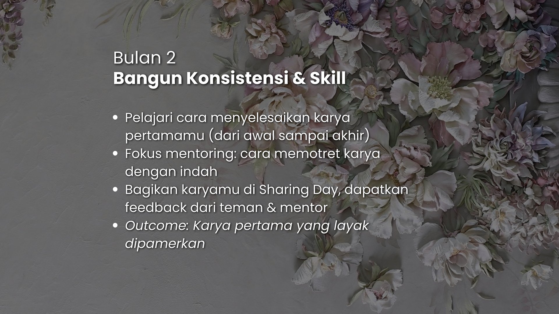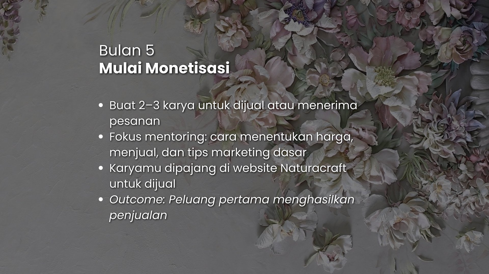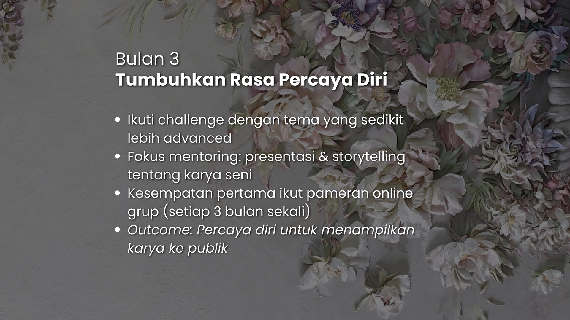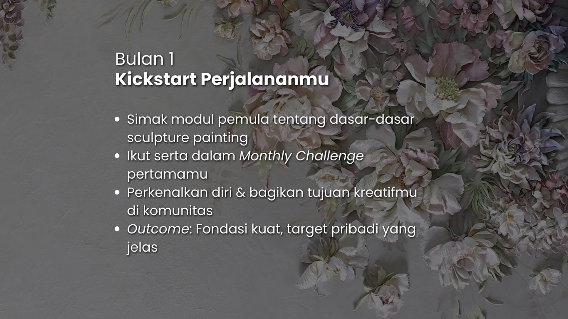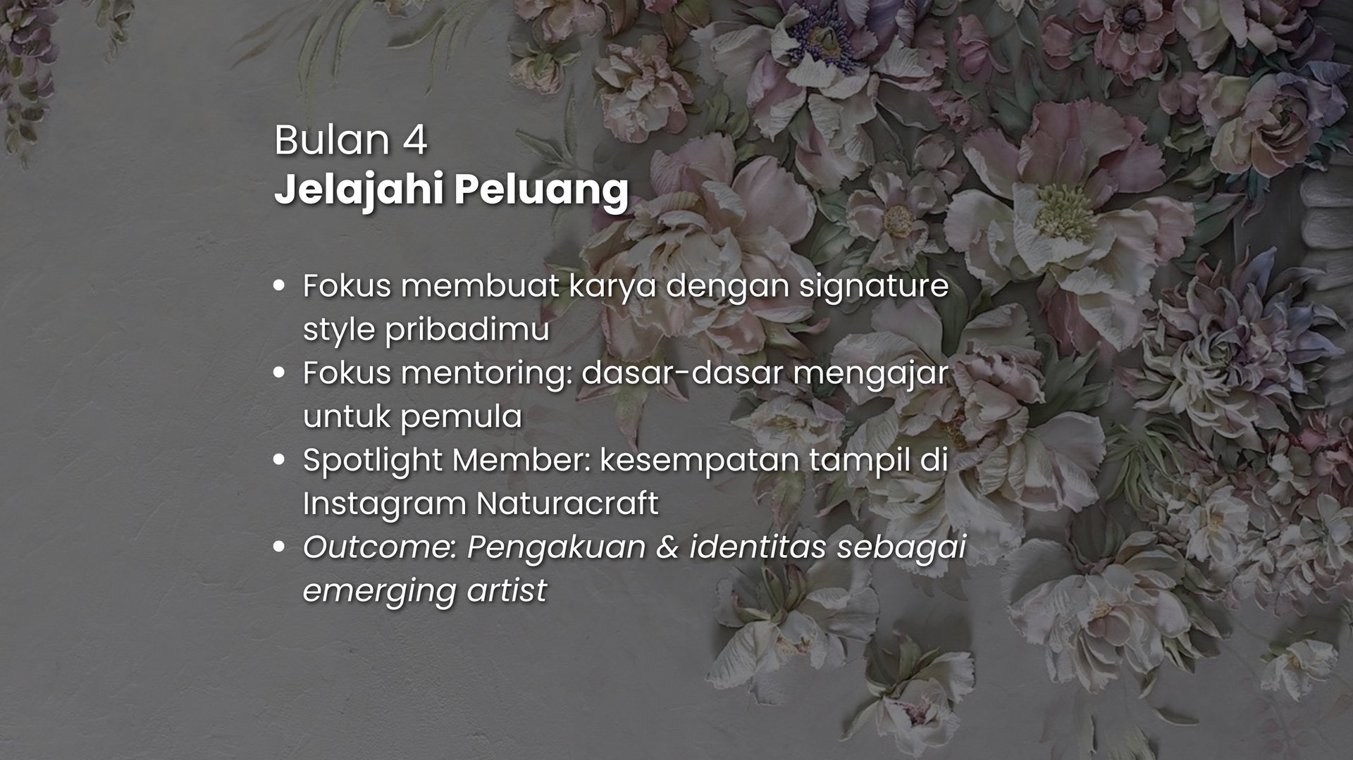 VIP Club adalah program kursus online resmi dari Evgenia Ermilova yang kini hadir dalam versi khusus Indonesia. Bukan sekadar kelas, VIP Club Indonesia dikembangkan menjadi komunitas aktif dengan kombinasi 30% pembelajaran (akses video kursus & mentoring bulanan) dan 70% aktivitas komunitas (challenge, sharing karya, pameran, peluang mengajar, hingga promosi karya di website Naturacraft). Di sini, setiap anggota tidak hanya berlatih teknik, tetapi juga bertumbuh bersama komunitas, mendapat dukungan mentor, dan membuka jalan menuju penghasilan dan seni.