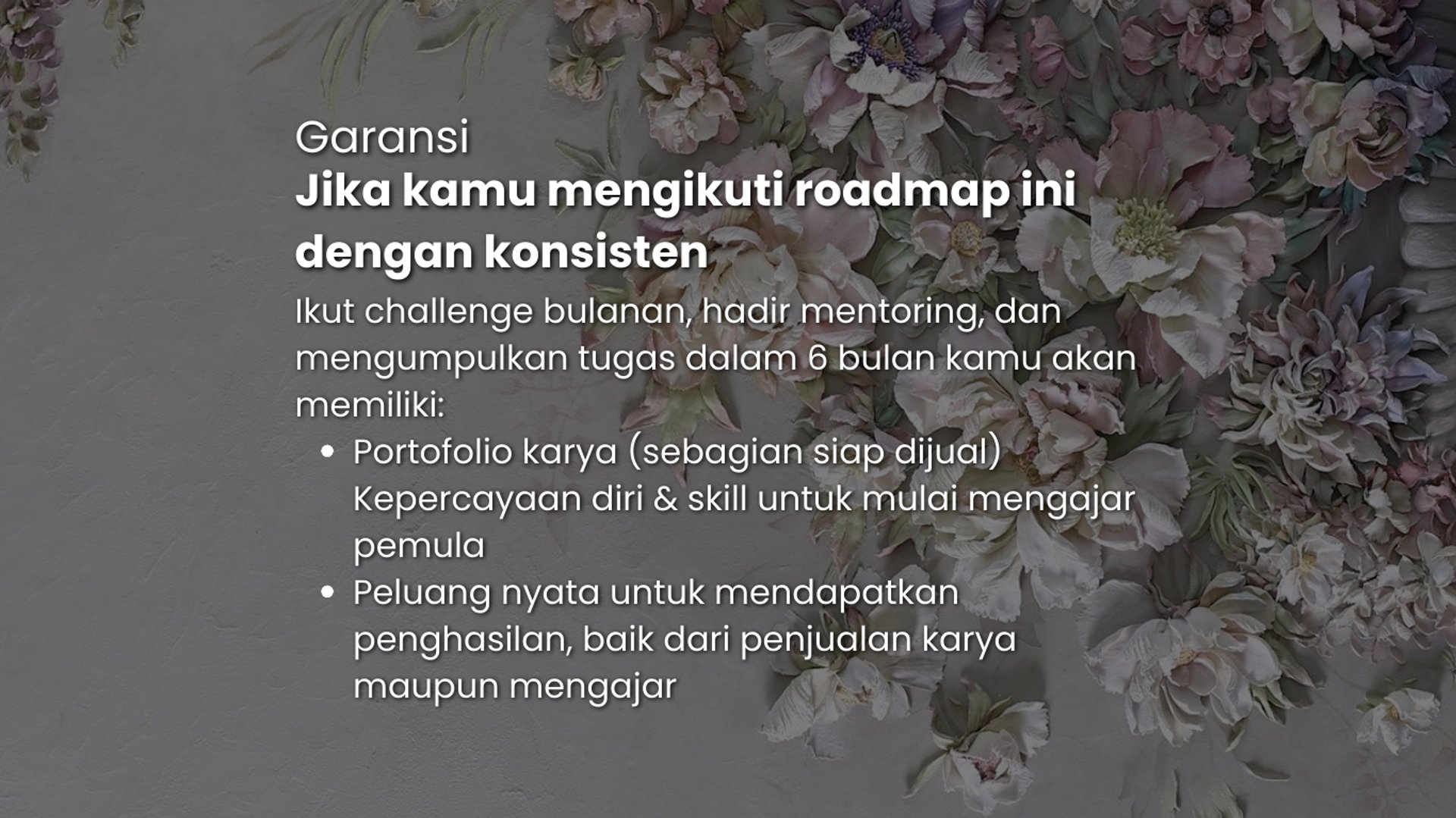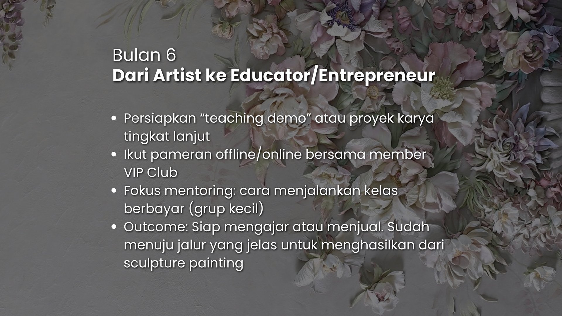 VIP Club dirancang agar hobi seni bisa berkembang menjadi sumber penghasilan. Dengan konsisten selama 6 bulan bagi peserta dengan pembayaran full payment, Anda akan bisa mulai menghasilkan dari Sculpture Painting :
